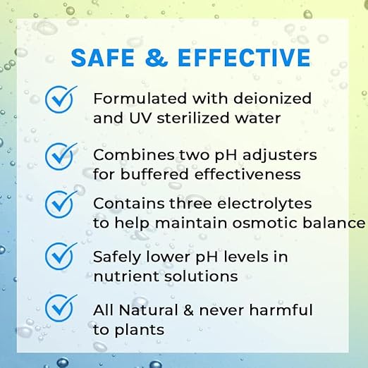 - SAFELY ADJUSTS PH: pH DOWN is formulated with deionized and UV-sterilized water to lower pH to ideal range; pH DOWN will not harm plants and is safe to use around humans and pets