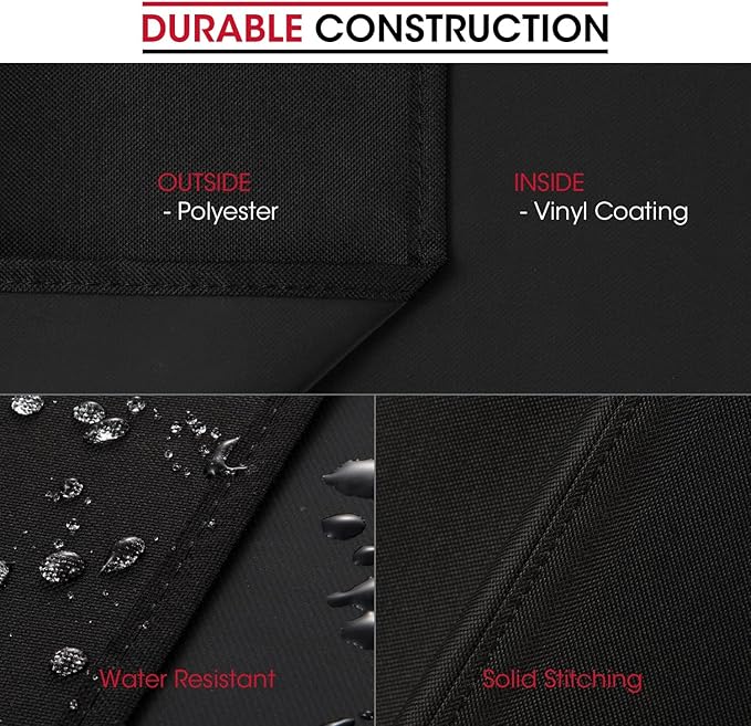 - 【Upgraded Material】- New special fade resistant fabric with vinyl coating, water repellent processed, the new material exhibits superior colorfastness, resists UV, repels rain, resists tears and cold cracking, durable and long-lasting, gives your grill all year round protection against sun, rain, snow, hail, wind, dust, dirt and etc.