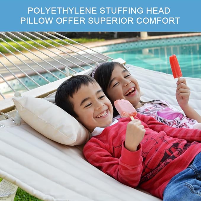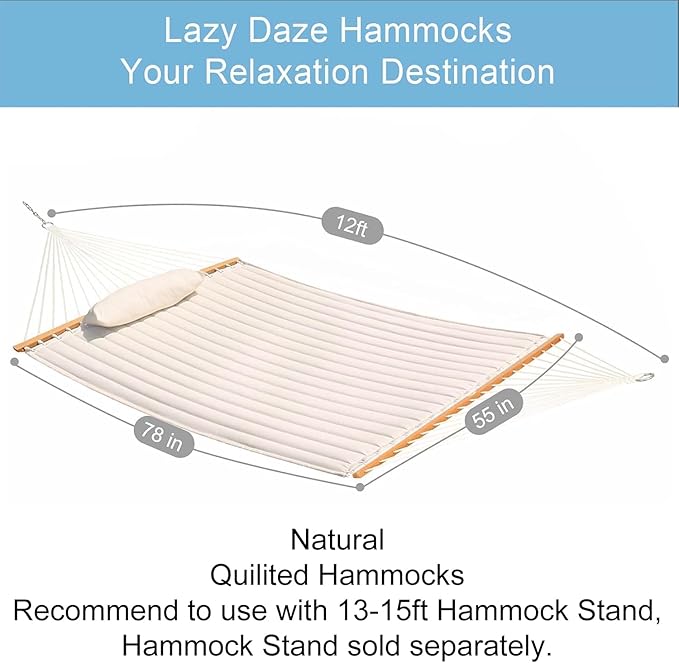 Lazy Daze Hammocks 12 FT Double Quilted Fabric Hammock with Spreader Bar and Detachable Pillow, 2 Person Hammock for Outdoor Patio Backyard Poolside, 450lbs Weight Capacity, Natural