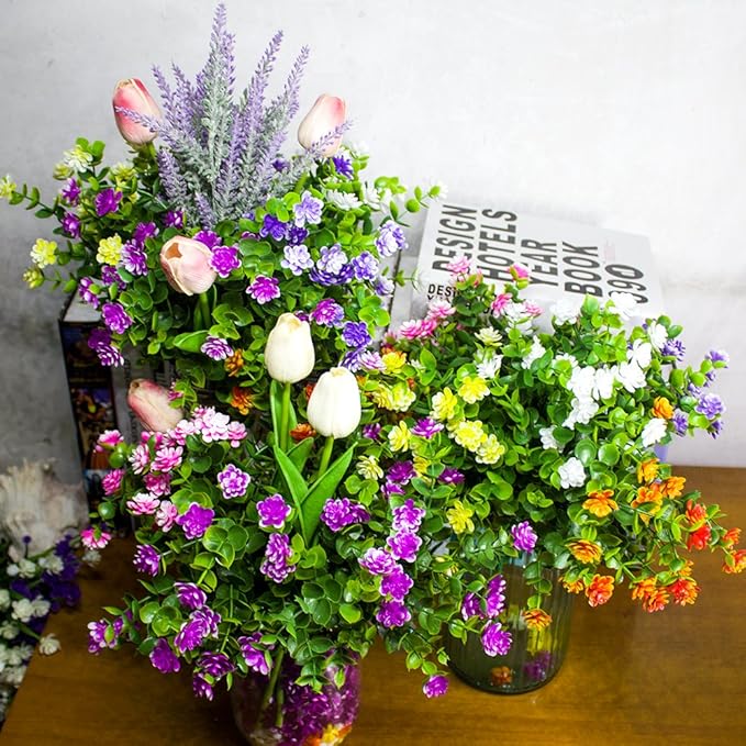 - 【Dimensions】: Fake flowers outdoor , 8.6" Wide x 13.39" Length, each shrub has 7 flexible stems and generous leaves. Pack of 4.