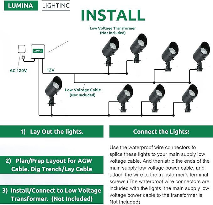 • 【Easy Installation】Just insert the (Light Ground Spike Stand) into the suitable position on ground, Then use Wire Connectors to Connect Landscape Lighting Fixtures. Light Fixture pre-wired with UL listed direct burial Wire/Cable. (Ready-To-Go SpotLights)