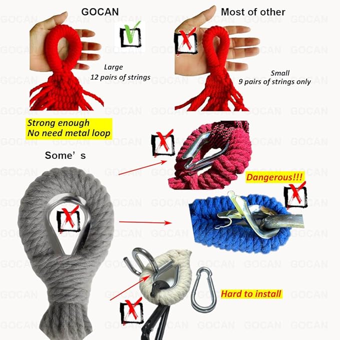 - 【3】Holds Up To 500 Lbs: The handcrafted knots at both ends and solid fabric are strong enough to holds up to 500 lbs. It is safe for couples, children and pets to relax or take a nap, the metal ring inside each end offers extra durability for long time using.