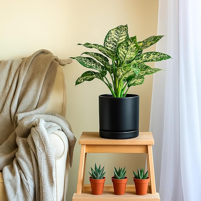 D'vine Dev 8.2 Inch Ceramic Planter Pot with Drainage Hole and Saucer, Indoor Cylinder Round Planter Pot, Black, 94-O-D-2