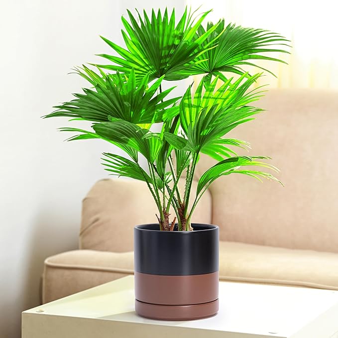D'vine Dev 6.5 Inch Ceramic Planter Pot with Drainage Hole and Saucer, Indoor Cylinder Round Planter Pot, Black/Speckled Tan, 94-O-C-7