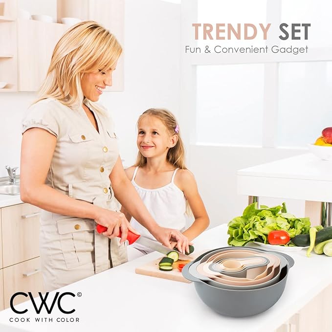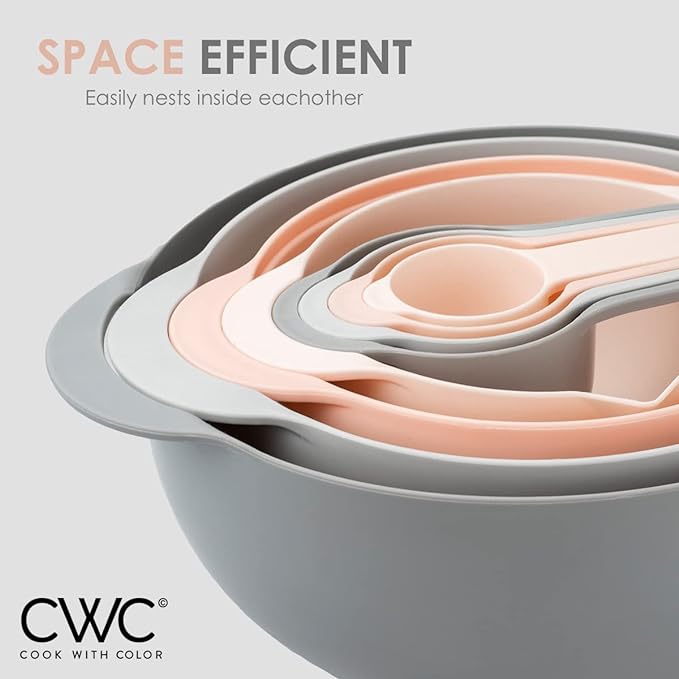 - Set Includes two mixing bowls (insert size of mixing bowls), one colander/strainer, one fine-mesh sieve/sifter, and four measuring cups- including sizes 1 cup, 1/3 cup, 1/2 cup, and 1/5 cup for a variety of uses.