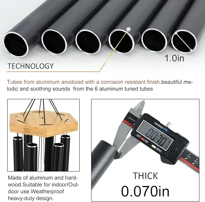 - Unique Wind Chimes Design-36-inch height from hanging hook to bottom wind catcher, the top beech wood offers a unique look. Secured with black nylon string, they hang from a strong S hook, EASILY TO HANG. 6 aluminum powder-coated tubes are hand-tuned; you can enjoy peaceful melodies that play as a whisper in the wind.