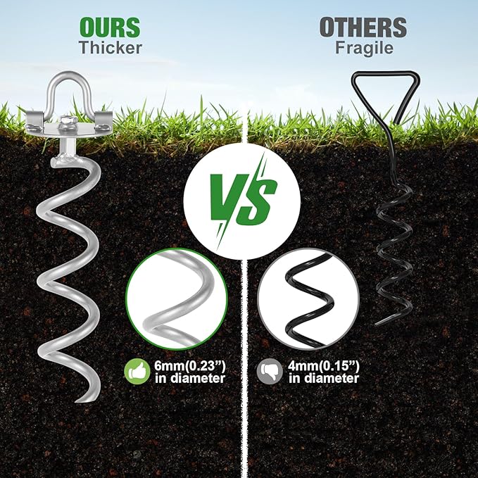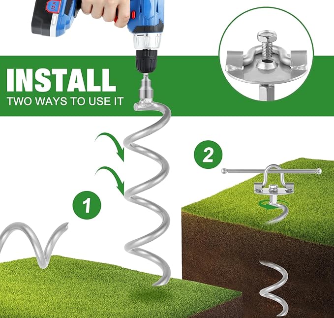 - EASY INSTALLATION AND USE - You only need to push the ground screw anchor head of the garden spiral stake into the ground, and you can directly rotate it by hand or electric drill until the spiral anchor is fully inserted into the ground. Outdoor spiral ground anchors are sturdy, very convenient to use, and very safe. This outdoor Spiral anchor is a good helper for your life.