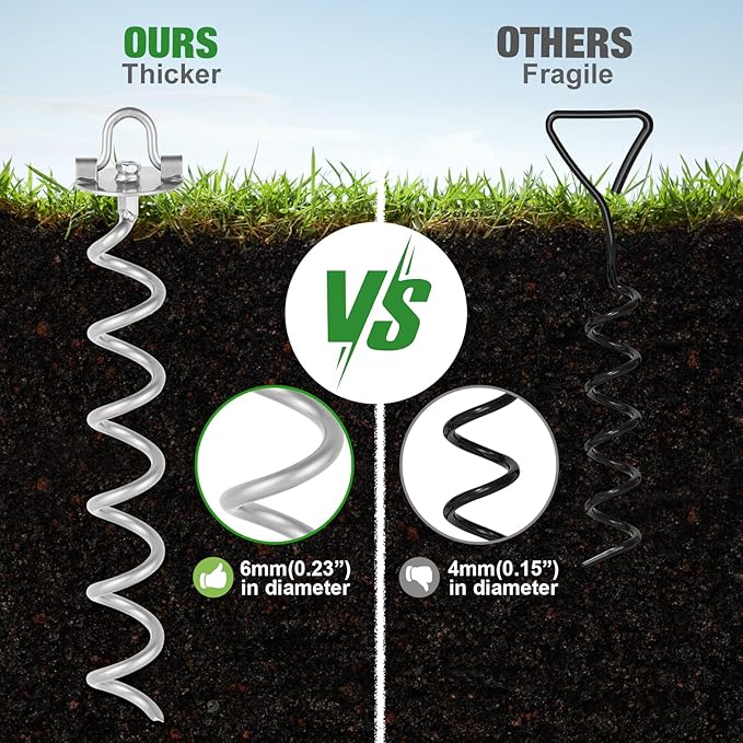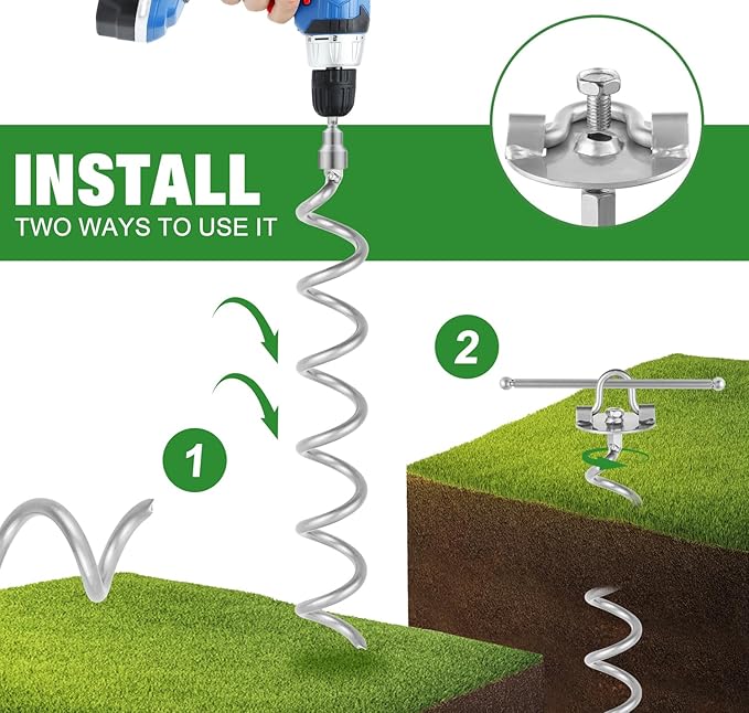 - EASY INSTALLATION AND USE - You only need to push the ground screw anchor head of the garden spiral stake into the ground, and you can directly rotate it by hand or electric drill until the spiral anchor is fully inserted into the ground. Outdoor spiral ground anchors are sturdy, very convenient to use, and very safe. This outdoor Spiral anchor is a good helper for your life.