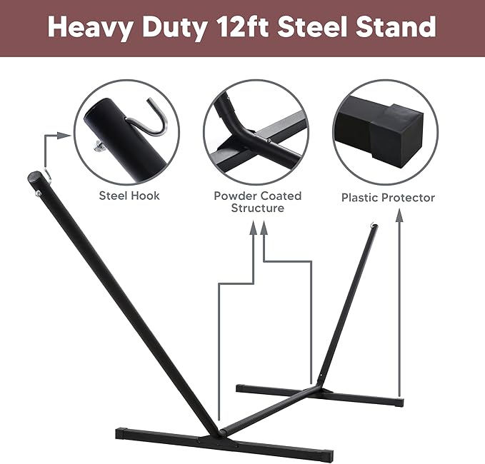 - Hammock with Portable Stand: No damage to trees. Created to be stable and long-lasting, the 12 ft stand is made from powder-coated heavy gauge steel. It can be easily assembled in minutes without any tools, and it could be disassembled easily, making it to be a portable hammock. Feel free to contact us if you have any questions during use within one year of purchase. We are always here to help