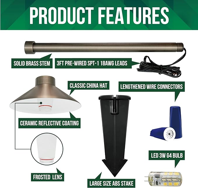 - ✔Die-cast brass construction: This brass landscape light is constructed of solid brass for durability and beauty. There will be natural patina over the surface of the brass housing overtime, helping the lights blend into your landscape.