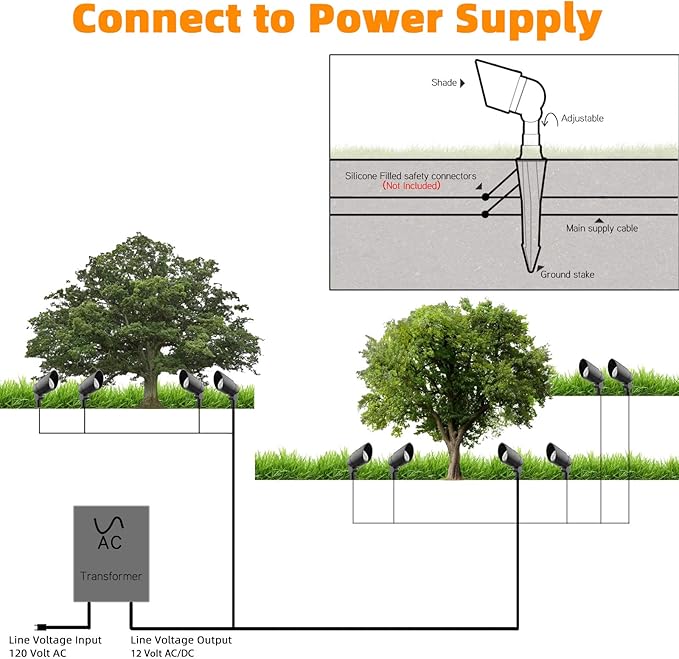 - š” Low Voltage Outdoor Landscape Spotlight - AC/DC 12V low voltage compatible with most 12V landscape lighting transformer system (The transformer and connectors are not included in this pack), there is very little risk of the electrical shock, it's safety and an easy DIY job.