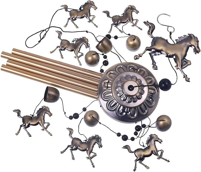 - UNIQUE DESIGN: Horse wind chimes, pure hand-made with 4 bronze premium aluminum tubes. 1 Round Metal Caps. 7 symbolizing good fortune horses, 6 Bells, 18 small lucky beads, 1 hook up. From the hanging ring to the bottom hanger, whole wind chimes measures 37 inches. Each metal tube has its own unique tone when it collides. Enjoy the wonderful music to soothe your body and mind. Enjoy peaceful melodies it plays. The sound is soft, clear and relaxing.