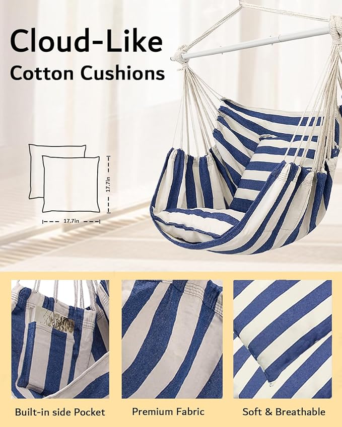 ADVOKAIR Hammock Chair Hanging Chair Swing Large Indoor with Anti-Slip Steel Spread Bar and Pocket-Max 500lbs-2 Cushions, Perfect for Bedroom,Outdoor,Patio, Porch,Backyard…