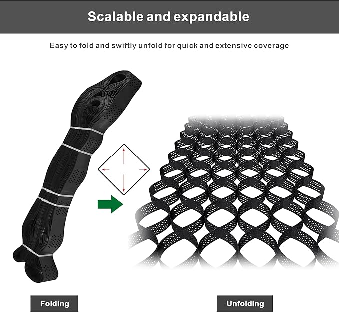 - 【4 in Geo Grid】Our geocell grid comes in a size of 9 x 17 ft, Coverage: 153 sq. ft. Each fully expanded single cell measures 10x 10 inches and stands at a height of 4 inches. With our innovative ground grid solution, you will enjoy more stability and durability for various terrains by getting solid, long-lasting surfaces that meet your different needs.