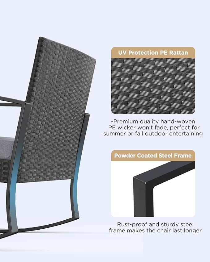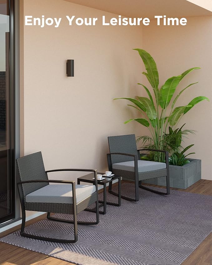 3 Pieces Outdoor Patio Furniture Set Rocking Bistro Set Outdoor Rattan Conversation with Coffee Table for Garden Balcony Backyard Poolside (Grey Cushion)