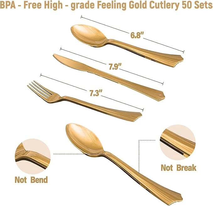- ✔「Sever for 50 Guests」 This blue paper plates set including 9" dinner paper plates *50, 7" paper dessert plates *50, 9oz paper cups *50 and luncheon napkins (3-ply, 6.5" x 6.5") *50, 50 sets of heavy duty gold plastic cutlery (50 forks, 50 spoons, 50 knives)