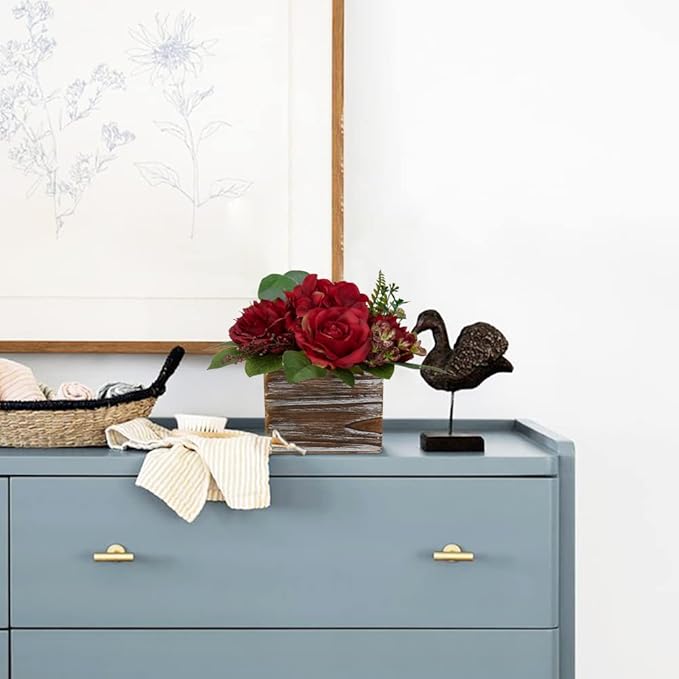 - MEDIUM ARRANGEMENTS - The artificial flowers are fixed in the wooden box, which is just the right size to put anywhere. Does not take up too much space and does not block the view. The petals are soft, and the shape can be fine-tuned manually, making the faux flowers in the pot fluffy, plump and more natural. Wooden arrangement size:5.2"Lx5.2"Wx8"H