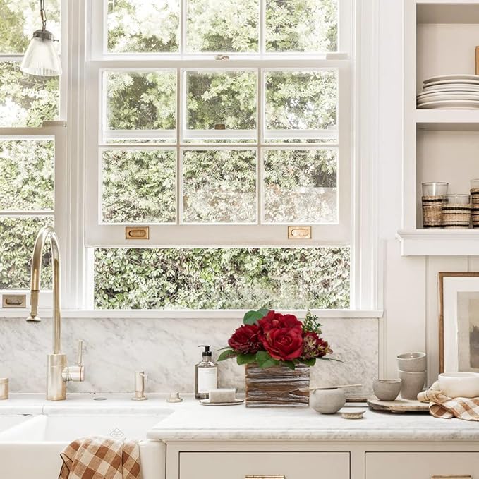 - PERFECT GIFT - These potted flowers are not only good for home decor indoor but also Give these Flower Arrangements with the wooden vase as a gift for housewarming parties, birthdays and Christmas. An ideal choice for window, coffee table, bookshelf, kitchen, hotel, office, bedroom, farmhouse, backyard, balcony decoration
