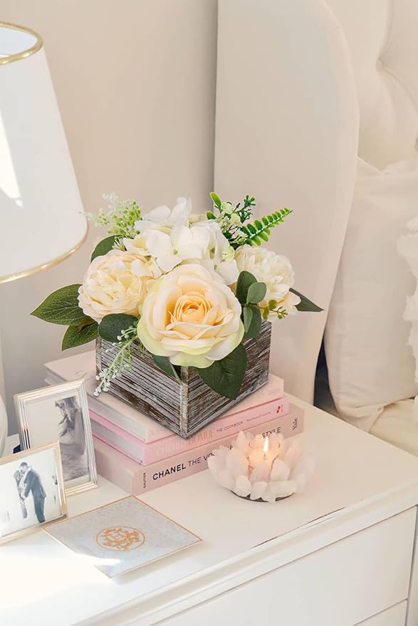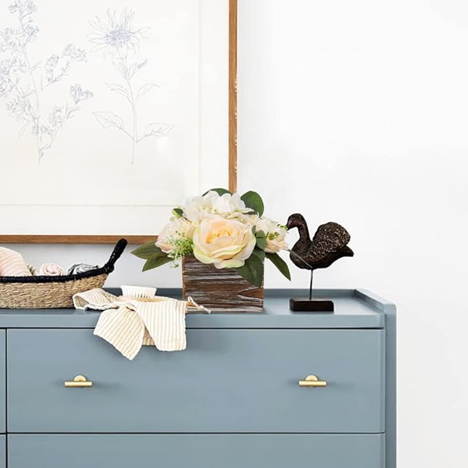 - MEDIUM ARRANGEMENTS - The artificial flowers are fixed in the wooden box, which is just the right size to put anywhere. Does not take up too much space and does not block the view. The petals are soft, and the shape can be fine-tuned manually, making the faux flowers in the pot fluffy, plump and more natural. Wooden arrangement size:5.2"Lx5.2"Wx8"H