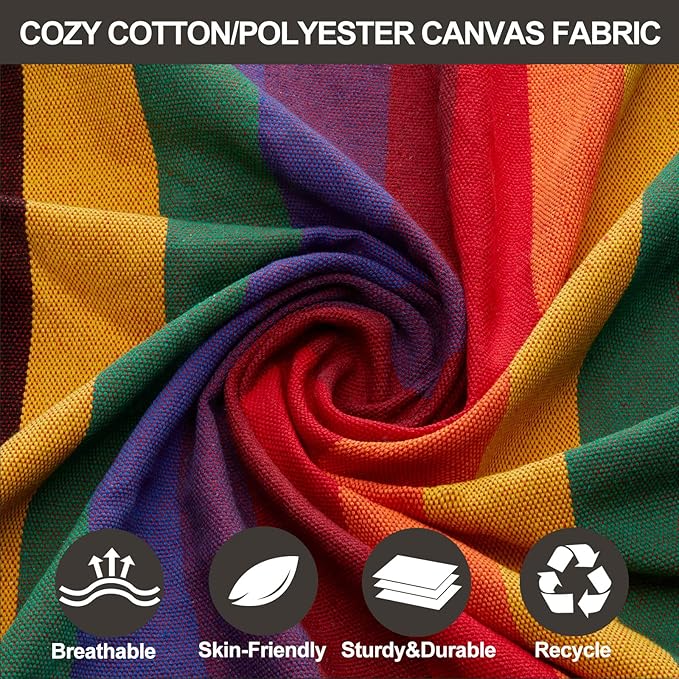 - Durable Hammock with 450LBS Weight Capacity,the cotton/polyester blended fabric is breathable and durable, with thick ropes and tight hand-weaven loops, Also,we prodvide two 2.5cm wide tree straps with high-strength polyester material and two 8cm carabiners,our hammocks are tested to hold 450lbs weight safely.