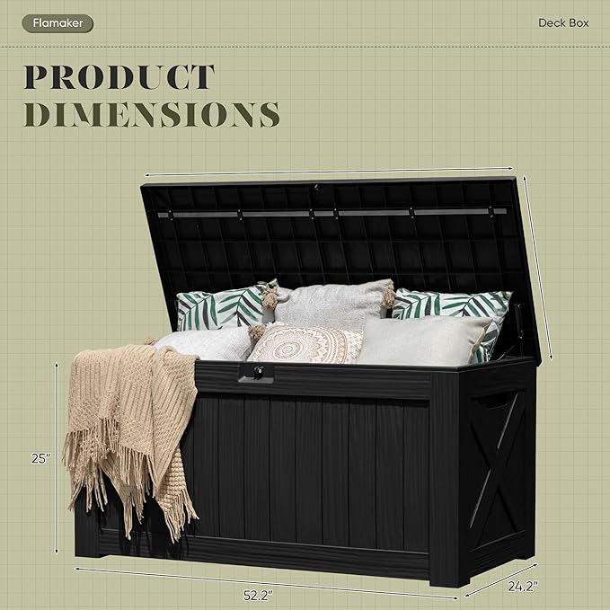 - [As a Seat] 53"*25"*25" Outdoor storage box large size, not only the storage capacity is guaranteed, but the storage cover can be used as a seat, which can be used by up to 2 people