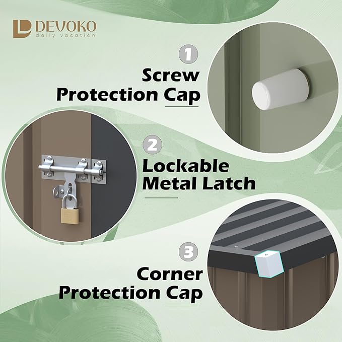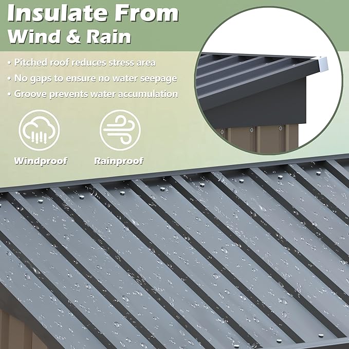 - [Security and Durability] The whole house is a steel frame structure, the metal garden storage shed adopts electro-galvanized steel process and paint treatment, which is suitable for various climates, without worrying about the metal rusting, the all-metal storage shed will not be deformed by the sun, and has excellent moisture-proof performance.