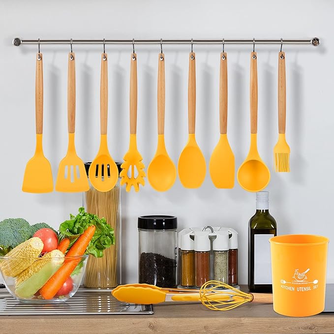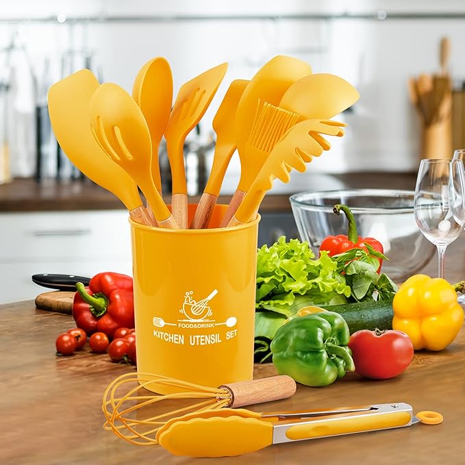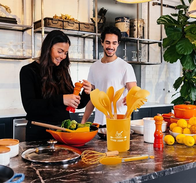 - 【Best Gift Ideal】Come With utensils holder for save space, the small hole on the handles for easy hung, and the utensil holder keeps utensils neatly stored, making the kitchen counter more tidy. Smart look and vibrant color would be a cheerful addition to any kitchen. Silicone cooking set as best gifts for women, mom, dad, friend and Chef. Any occasion like birthday, Mother's Day and wedding party, housewarming, Christmas or Thanksgiving - that will be the most useful present!
