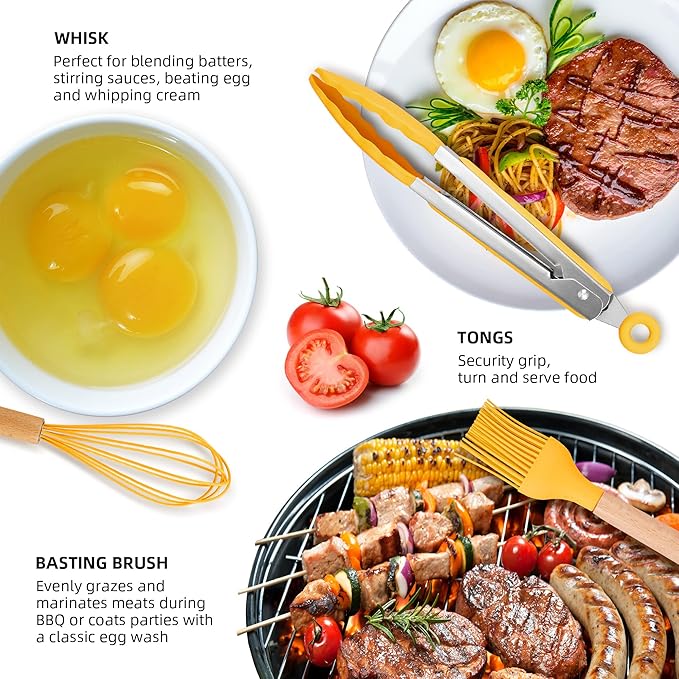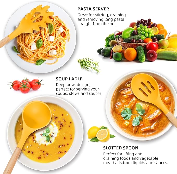 - 【Safe, Food Grade Silicone】The kitchen utensil set is made of food grade silicone, which protects the surface of non-stick pans from scratches. Silicone cookware set is safe for any type of food. Don't worry about it melting into your food or producing any hazardous substances. Notes: It must be soaked for half an hour when it is used for the first time, and then exposed to the air for 2-3 hours.