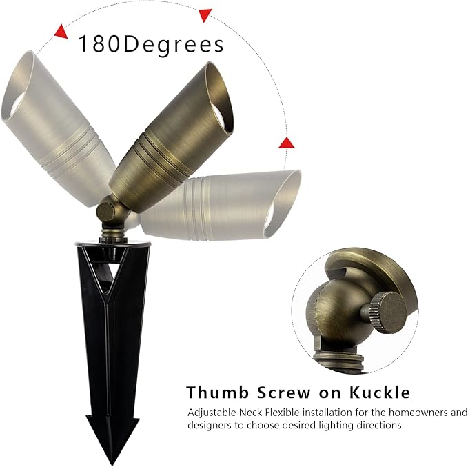 - ☄ Easy Installation—Just screw the ground stake on to the spotlight and Insert the Heavy Duty ABS ground stake into the suitable ground where you want,Easy to adjust cast brass knuckle for perfect angling of the light.