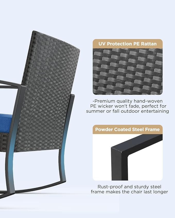 - Modern and Ergonomic Design: Hand-made PE rattan and sturdy iron frame with anti-coating make our patio set more durable and last longer. High-density sponge and slight rocking function to rock yourself into a state of relaxation