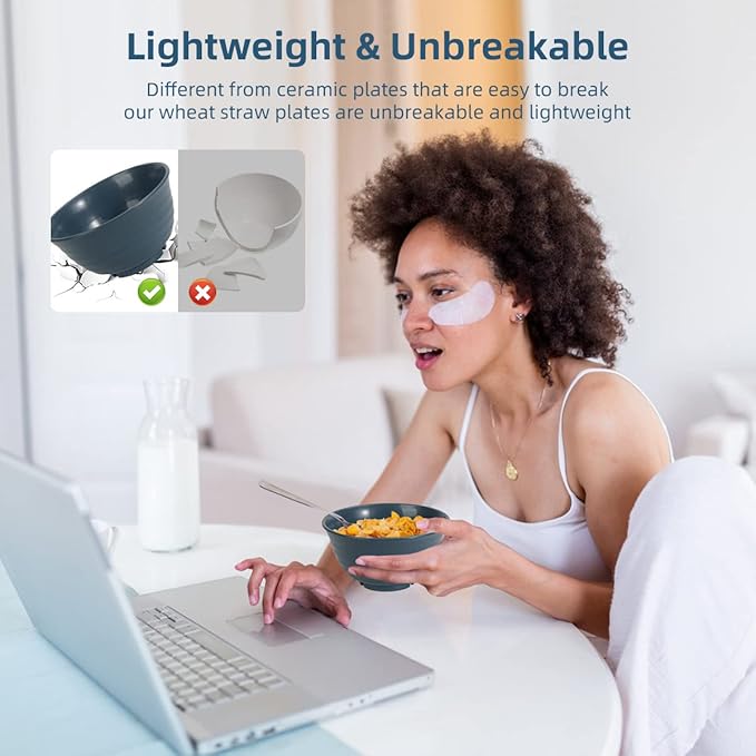 - 【Lightweight & Durable & Unbreakable】Compared to ceramic dinnerware, our wheat straw dinnerware set is more lightweight and not easy to break. These plates and bowls sets are seriously drop-proof, shatterproof, shard-proof and safe for everyone. No more worrying about breaking and replacing mismatched dinnerware. Perfect for your toss-happy tots!