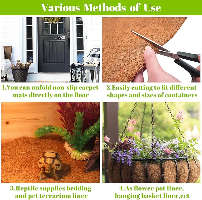 - Premium Material: Riare non-slip carpet mats are made of 100% natural coconut fiber which are sturdy enough to use for a long time without damage. These coconut fiber liner can avoid the loss of soil and fertilizer and absorb water which can promote the healthy development of the root system of the plant and are perfect for growing various plants