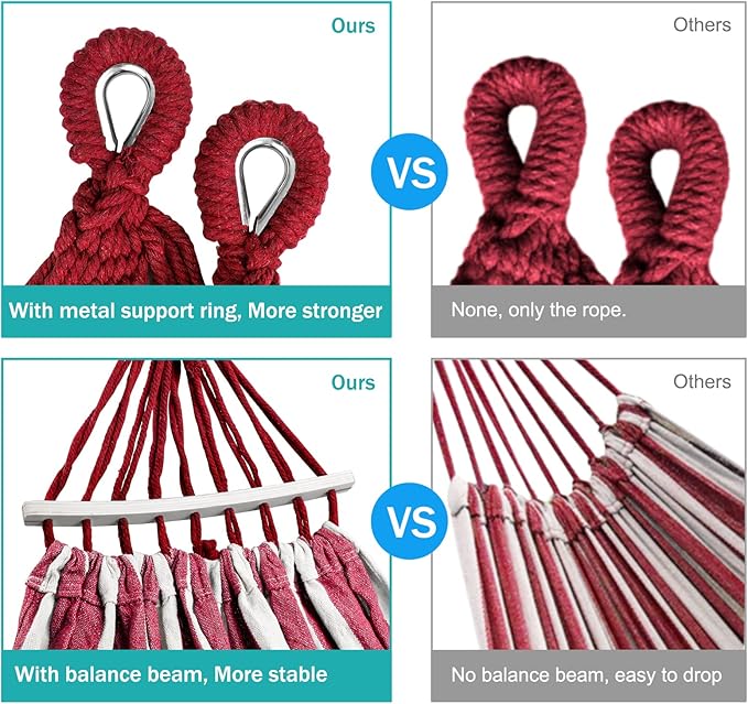 - 【Sturdy Metal Knot】The metal knot can prevent the long term friction between the knot and the tie rope. This prolongs the life of the tree hammock (extends the time limit by 50%). Additionally, the hammock comes with straps, ensuring a secure and stable attachment to trees.
