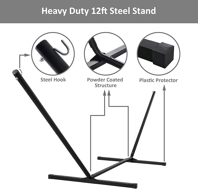 - Hammock with Portable Stand: No damage to trees. Created to be stable and long-lasting, the 12 ft stand is made from powder-coated heavy gauge steel. It can be easily assembled in minutes without any tools, and it could be disassembled easily, making it to be a portable hammock. Feel free to contact us if you have any questions during use within one year of purchase. We are always here to help.