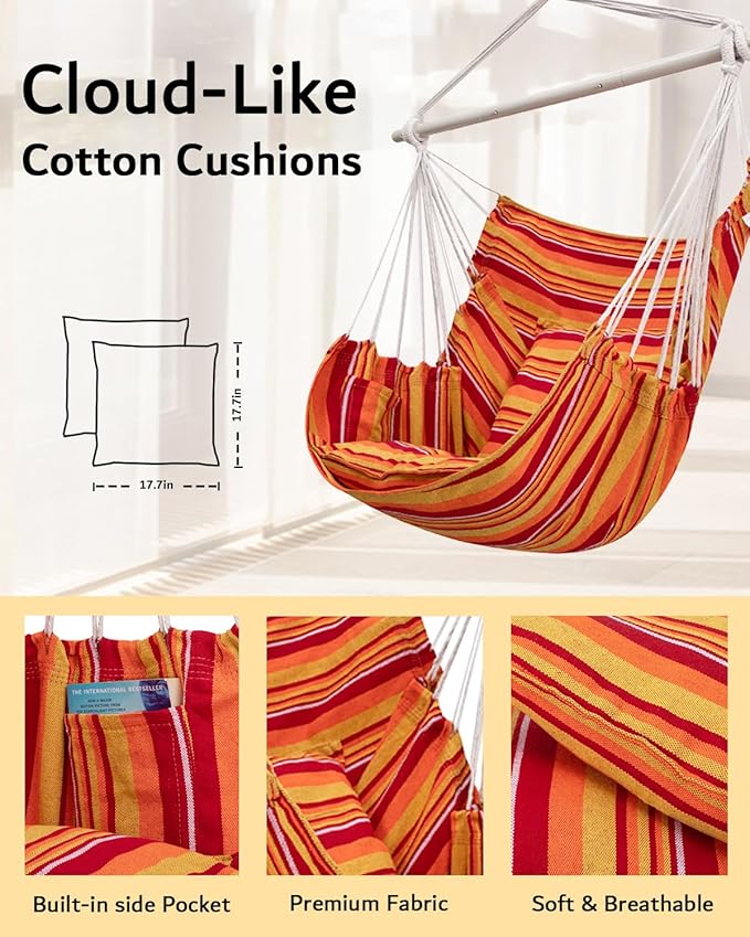 ADVOKAIR Hammock Chair Hanging Chair Swing Large Indoor with Anti-Slip Steel Spread Bar and Pocket-Max 500lbs-2 Cushions, Perfect for Bedroom,Outdoor,Patio, Porch,Backyard…