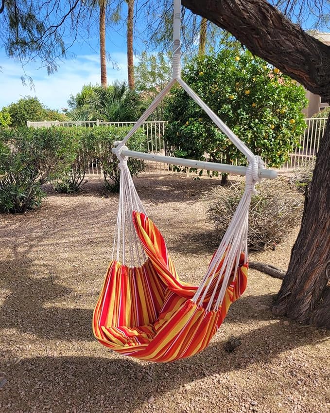- Indoor & Outdoor: Perfect for relaxing with the chair swing in your bedroom, patio, yard, garden. This stylish hammock swing hangs anywhere and is easy to relocate. Simply find a branch, beam or hammock stand and set it up in seconds. This comfortable chair allows you to sit or lie down in it and sway in the breeze