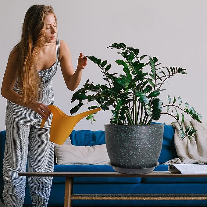 WOUSIWER Plant Pots 10/9/8 inch, Set of 3 Modern Decorative Plastic Planters with Drainage Holes and Saucers for House Plants Indoor Flowers Plants, Black with Green Speckles