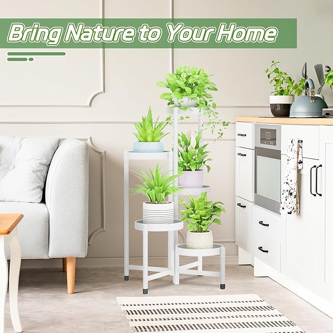 iDavosic.ly Plant Stand Indoor Outdoor, 5 Tier Corner Metal Flower Display Holder Shelf, Folding Tall Orchid Rack for Patio Balcony Porch Garden Living Room House, White