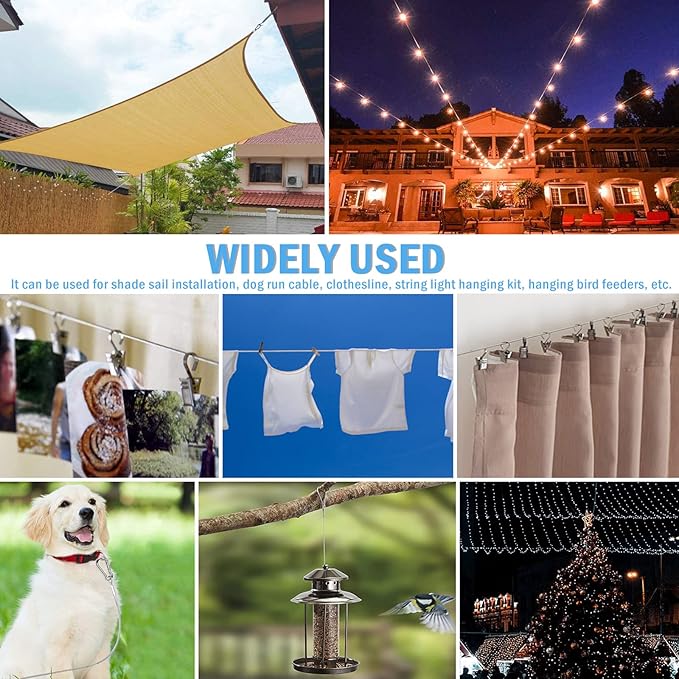- 【Multifunctional outdoor/indoor hanging kit】: This sun shade hardware kit is not only used for the installation of shade sail, but also frequently used as dog run cable, picture hanging wire, aircraft cable, clothesline, string light hanging kit, DIY deck railing, hanging bird feeder, climbing plant, etc. It's a great choice for hanging indoor/outdoor curtains, wind chimes, decorating Christmas/Halloween as well.