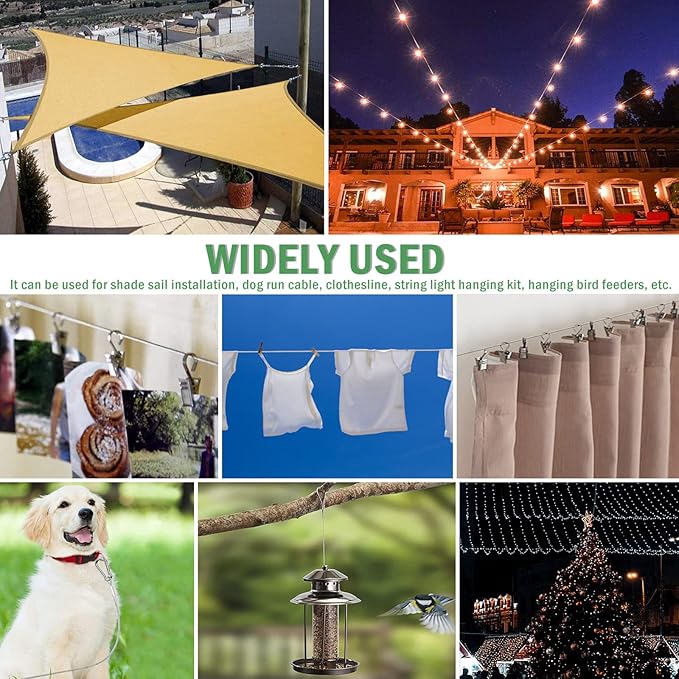 - 【Multifunctional outdoor/indoor hanging kit】: This sun shade hardware kit is not only used for the installation of shade sail, but also frequently used as dog run cable, picture hanging wire, aircraft cable, clothesline, string light hanging kit, DIY deck railing, hanging bird feeder, climbing plant, etc. It's a great choice for hanging indoor/outdoor curtains, wind chimes, decorating Christmas/Halloween as well.