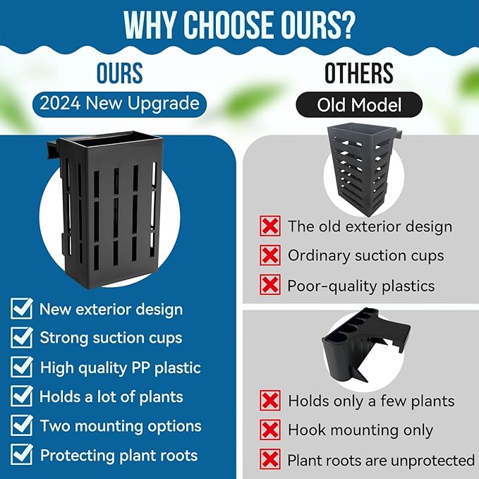 - 🍀For All Your Needs🍀 - This aquarium plant holder is uniquely designed and easy to use. It can be used in two ways, it can be hung stably on the glass edge of various aquariums (glass thickness is less than 0.8 inch/2 cm) or it can be attached to the aquarium glass by mounting suction cups. The planting area is larger, prettier and more stable than other types of aquarium plant holders. It is perfect for pothos, bamboo, lotus, daffodils, water poppies and more semi- or fully aquatic plants.