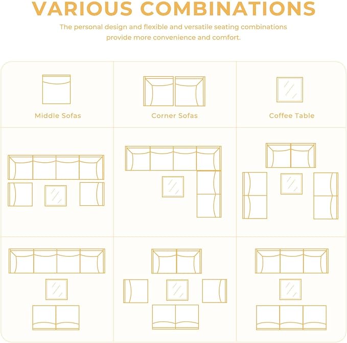 - MODULAR DESIGN: This outdoor sectional sofa set includes 2 corner chairs, 4 armless chairs, and 1 glass-top coffee table that offer flexibility and many layout combinations. The sectional seats connect to each other with a connector clip so they will not separate. Weight Capacity: 350 lbs