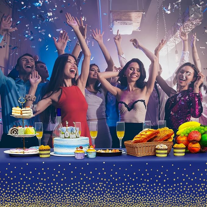 - ✧【Multiple Uses】Navy blue and gold dot tablecloths can create a party atmosphere and are perfect for celebrations like birthday party. Suitable for indoor and outdoor use. Ideal for parties, banquets, birthdays, baby shower, picnics, weddings, graduation, Valentine's Day decorations, Thanksgiving dinners, Christmas celebrations, etc. Not only suitable for parties, but suitable for decorating! Plus, navy blue table cloths for parties can also be used as decorative background banners or graffiti table covers to keep your table clean