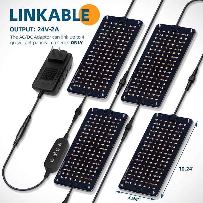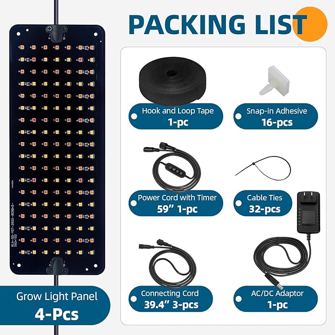 - What You Get: 4 x Barrina Grow Light Panel, 1 x AC/DC Adaptor, 1 x Power Cord with Turn On/Off Timer, 3 x Connecting Cords, 1 x Hook and Loop Tape, 16 x Snap-in Adhesive, 32 x Cable Ties