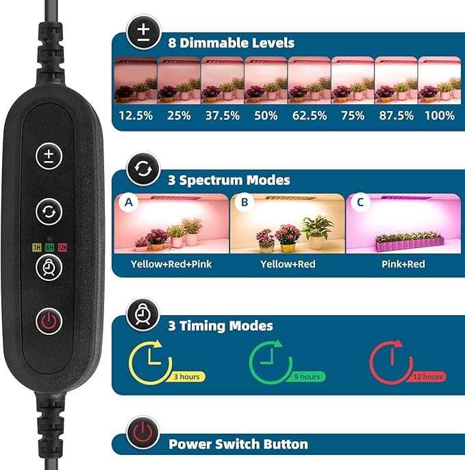 - 3 Spectrum Modes & 8 Dimmable Options: Our plant growing lamp has 3 Spectrum Modes can be set to meet different stages of plant growing needs, and 8 levels of dimmable options (100%-87.5%-75%-62.5%-50%-37.5%-25%-12.5%) suitable for every cycle of plant growth, also ensuring the light needs of plant growth. Give your plants better care by giving them the proper light intensity they desire