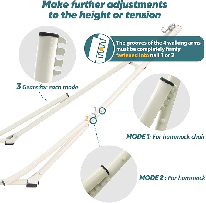 - Easy to Assemble :Hammock stand can be easily set up or take it down in just a few minutes without tools. Removable screw design, with the adjustable hooks on the stand, you can decide how low or high the hammock to swing.Both backyard and portable hammock stands are easy to set up and hang your hammock from. And you don’t need to measure the distance between anchor points.Free yourself from head to toe and enjoy the fun of the hammock stand.