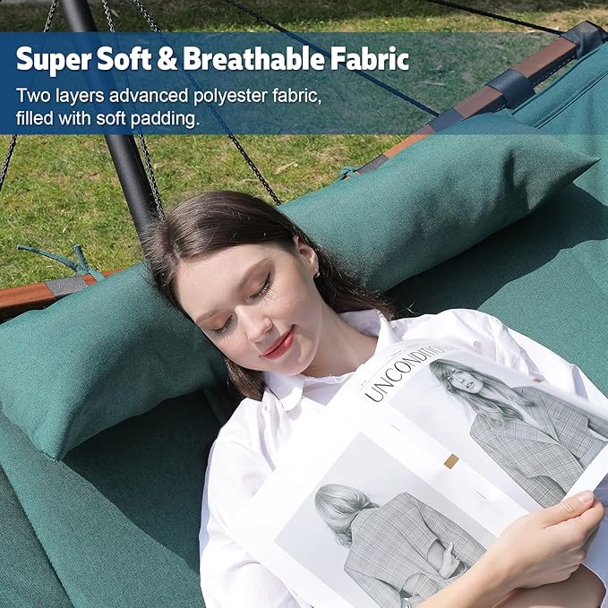 TegerDeger 12FT 2 Person Hammock with Stand Included 55 x 79IN Large Hammock 450LB Capacity with Hardwood Spreader Bar & Nylon Rope for Outside, Patio, Garden, Backyard, Beach, Poolside - Dark Green