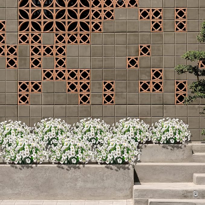15 Bundles Artificial Flowers Outdoor UV Resistant Fake Silk Plants Plastic Faux Shrubs Outside Front Porch Window Box Garden Home Hanging Planter Decoration (White)