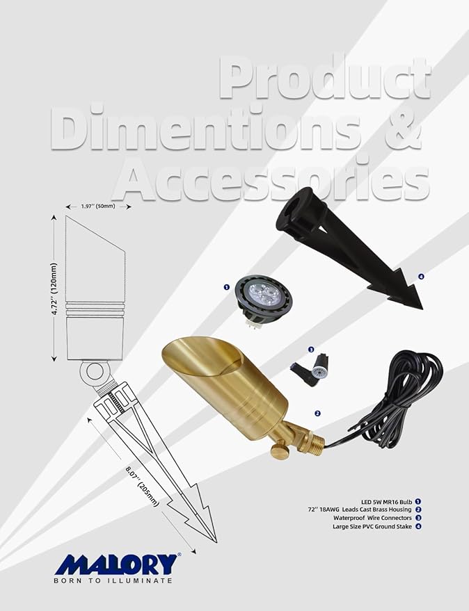 - BRASS LIGHT FIXTURE:MALORY landscape spotlight is constructed of die-cast brass for durability and beauty.Brass spot light doesn't corrode,more durable and reliable than aluminum and plastic fixtures,ideal for any uplighting application.Simple design structure for the light fixture make it looks beautiful yet unobtrusive in any landscape,suitable for decorating most houses and yards.