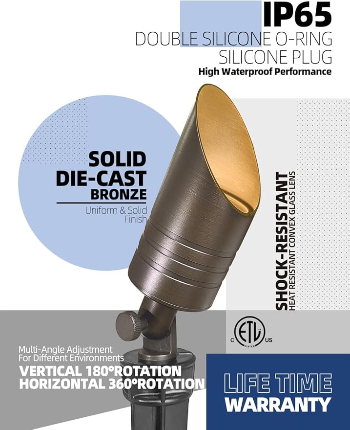 - WIDELY USED:Features a 180°vertical rotation heavy duty adjustable knuckle and 360°horizontal rotation with the stake, you can light to any angle you want, even if you don't move the position. CRI 85+ low voltage garden patio spot up light bring out the natural color of objects, suitable for garden, yard, tree, house exterior, lawn and shrub.